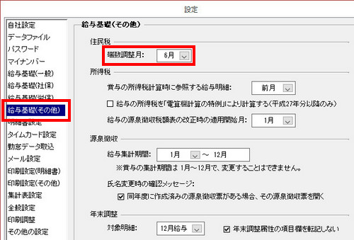 (2) | [給与基礎(その他)]をクリックし、[住民税]内にある[端数調整月]欄の[▼]ボタンをクリックして、月を選択します。 |