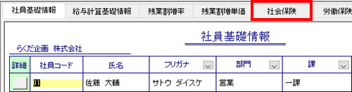 | (2) | 「社員基礎情報」画面が表示されますので、[社会保険]タブ(または[社会保険・労働保険]タブ)をクリックします。 |