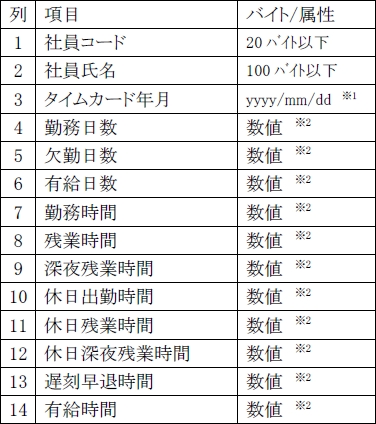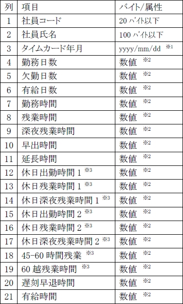 | ※1 | 「タイムカード年月」は「yyyy/mm/dd」形式で入力し、「dd」は「01」とします。(例えば2019年10月のデータの場合、「2019/10/01」と入力します) |