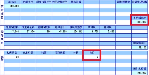 | 例:支給額合計が2円多く、勤怠項目の「有給」項目に「2」を入力している場合 |