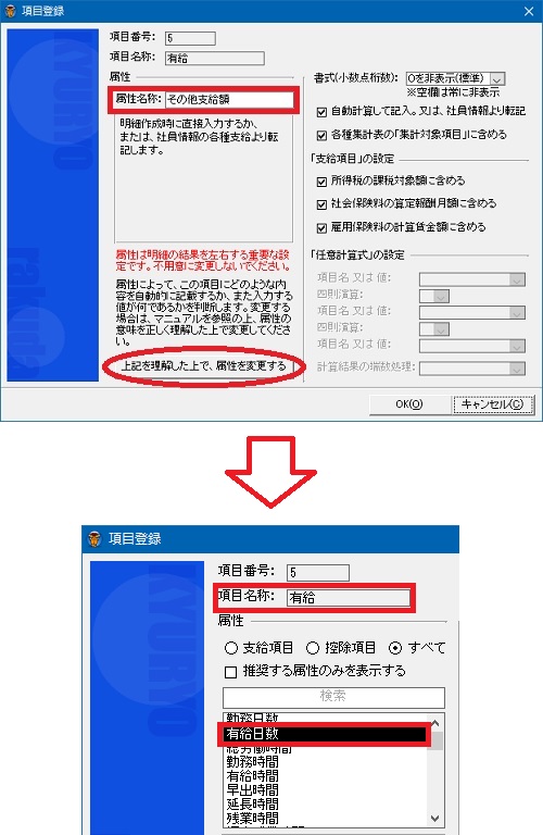 | 例の場合、「有給」項目の属性が、支給項目の属性「その他支給額」になっていますので、「有給」に対する適切な属性「有給日数」を選択します。 |