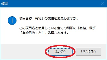 | (4) | 「項目名称「○○」の属性を変更しますか?〜」という確認メッセージが表示されますので、[はい]ボタンをクリックします。 |