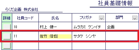 | (2) | 「社員基礎情報」画面が表示されますので、削除したい社員名をクリックしてカーソルを置いた状態で、画面下部の[削除]ボタンをクリックします。 |