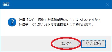 | (3) | 「社員「○○」を退職者扱いにしてよろしいですか?〜」という確認メッセージが表示されますので、[はい]ボタンをクリックします。 |