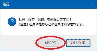 | (5) | 「社員「○○」を削除しますか?〜」という確認メッセージが表示されたら、[はい]ボタンをクリックします。 |