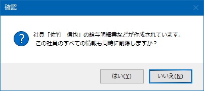 | ※「社員「○○」の給与明細書などが作成されています。〜」という確認メッセージが表示された場合は、その社員氏名で作成されている給与明細書等も同時に削除されますのでご注意ください。 |