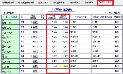 | 各事業所に送付される「市区町村民税・都道府県民税特別徴収額通知書」には、6月と7月以降の住民税が記載されています。これを以下の手順で「社員台帳」に設定します。 |