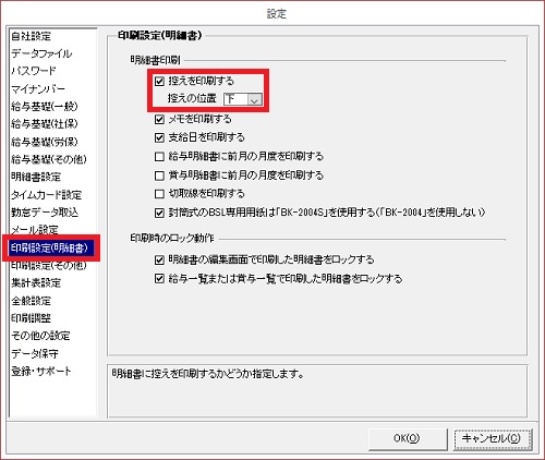 | ※「給料らくだ5」以降で、用紙型番「BK-2004S」「BK-2005」をご利用の場合は、上記設定の如何を問わず控えが必ず印刷されます。 |
