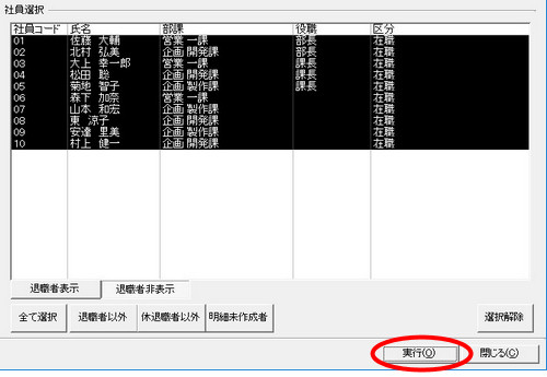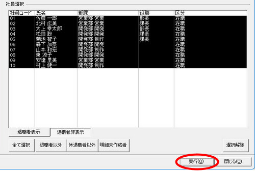 | (2 | -4)「給与明細書の複写」画面が表示されますので、(1)で新規登録した社員も含め、在職者をすべて選択し、[実行]ボタンをクリックします。 |
