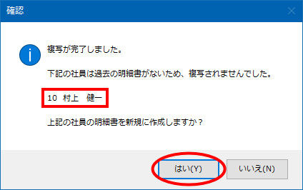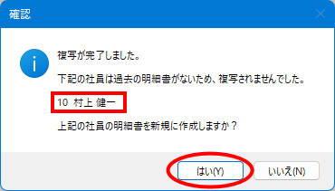 | (2 | -5)「複写が完了しました。〜上記の社員の明細書を新規に作成しますか?」というメッセージが表示され、新入社員の氏名が表示されていることを確認し、[はい]ボタンをクリックします。 |