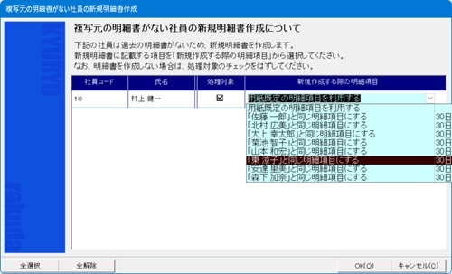 | (2 | -6)「複写元の明細書がない社員の新規明細書作成」画面が表示されます。新入社員の[処理対象]にチェックを入れます。さらに、[新規作成する際の明細項目]で、他の在職者のうち誰と同じ明細項目にしたいか、または用紙既定の明細項目を利用するかを選択します。 |
