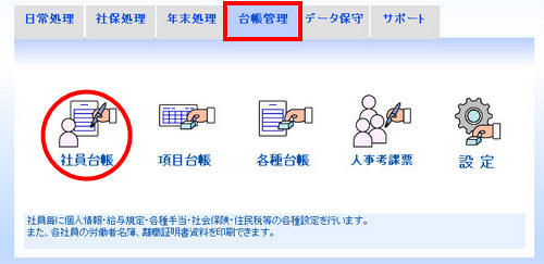 | (1 | -1)メインメニューの[台帳管理]タブをクリックし、[社員台帳]アイコンをクリックします。 |