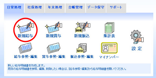 | (2 | -1)メインメニューの[新規給与]([給与明細書])アイコンをクリックします。 |