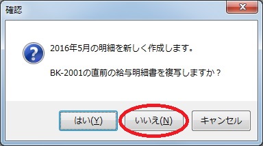| (2 | -3)「〜直前の給与明細書を複写しますか?」のメッセージが表示されますので、[はい]ボタンをクリックします。 |