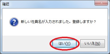 | (4) | [Enter]キーで確定すると、「新しい社員名が入力されました。登録しますか?」というメッセージが表示されますので、[はい]ボタンをクリックします。 |