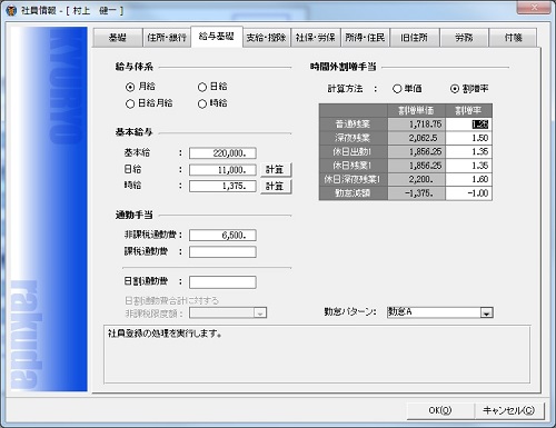 | (5) | 「社員情報」画面が表示されますので、「基本給」等、必要事項を入力します。 |