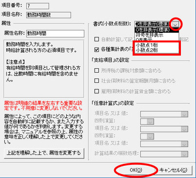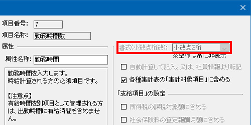 ※「給料らくだ6」以降で、60進法の設定にしている場合、時間数項目の書式はすべて「小数点2桁」に固定となり、変更することはできません。 |