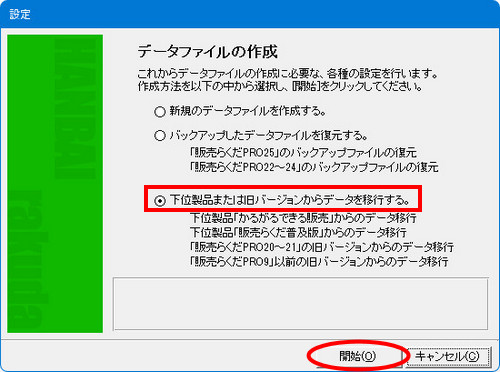 | (3- | 1)「新規データファイルの作成」画面で、表示されている項目の中から、「下位製品または旧バージョンからデータを移行する。」または「旧バージョンからデータを移行する。」を選択し、[開始]ボタンをクリックします。 |