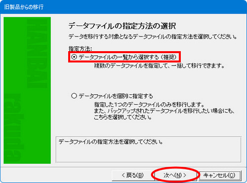 | ※データファイルが自動検出されなかった場合、[データファイルを個別に指定する]の方に「(推奨)」と表示されます。旧製品が同じコンピューターにセットアップされていない場合や、データファイルを移動されている場合はこちらを選択し、手動で旧製品のデータファイルまたはバックアップファイルを指定してください。 |