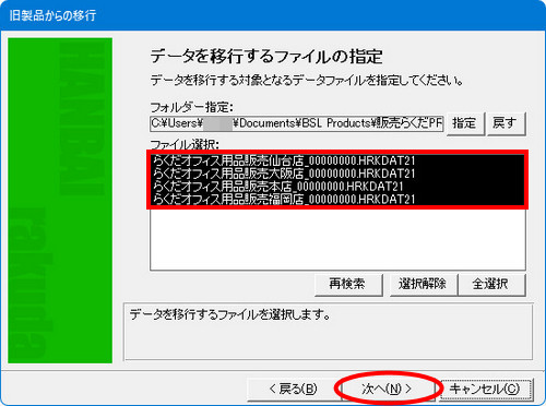 | (3- | 4)「データを移行するファイルの指定」画面で、移行したいデータファイルをすべて選択し、[次へ]ボタンをクリックします。 |