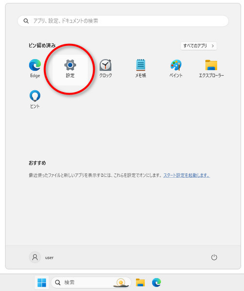 (2) 表示されるメニューの一覧から、[設定]をクリックします。
