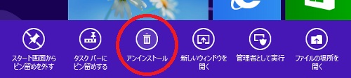 スタート画面上で削除する製品名を右クリックし、画面下の[アンインストール]をクリックします。