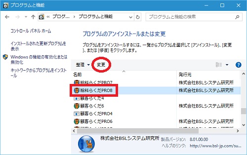 (2) コンピュータにインストールされているプログラムのリストが表示されますので、削除する製品名をクリックし、[変更]ボタンをクリックします。