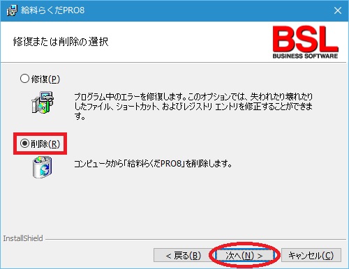 (4) 「修復または削除の選択」画面が表示されますので、[削除]を選択します。