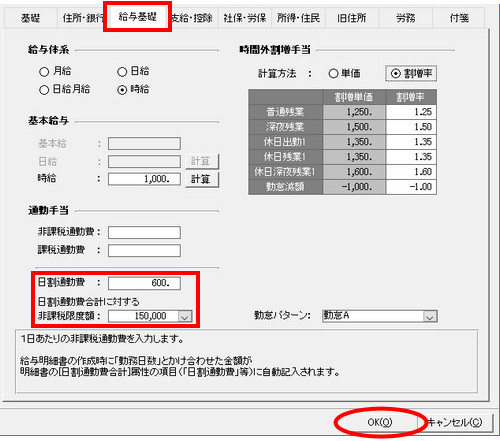 | (1- | 3)「社員情報」画面で、[給与基礎]タブ内の[日割通勤費]欄に一日あたりの通勤費を入力し、[日割り通勤費合計に対する非課税限度額]を設定して、[OK]ボタンをクリックします。 |