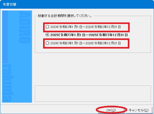 | (2) | 「年度切替」画面が表示されますので、[前期]または[次期]を選択し、[OK]ボタンをクリックします。 |