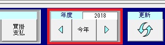 | 出納帳等の入力画面で新年度の入力をする場合は、画面の下部にある年度の[今年]ボタン(または右向き三角ボタン)をクリックすることで入力年度を変更できます。 |