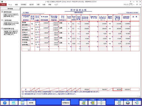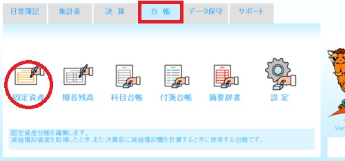 | メインメニューの[台帳]タブ内にある、[固定資産]アイコンをクリックし、「固定資産台帳」画面で入力を行ってください。 |