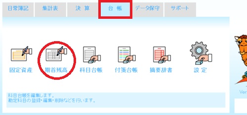 | (1) | メインメニューの[台帳]タブをクリックし、[期首残高]アイコンをクリックします。 |