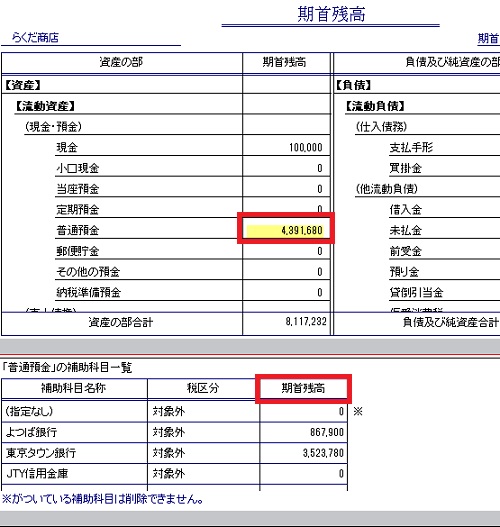 | (3) | 補助科目ごとに設定する場合は、科目名をクリックした後、画面下部の「補助科目一覧」にある「期首残高」欄に入力します。 |