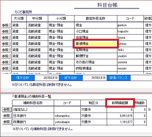 | (3) | 補助科目ごとに設定する場合は、科目名をクリックした後、画面下部の「補助科目一覧」にある「前期繰越額」欄に入力します。 |