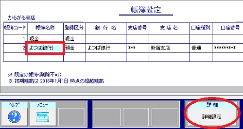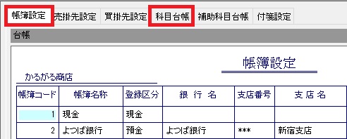 | (2) | 銀行名の場合は[帳簿設定]、科目名の場合は[科目台帳]タブをクリックします。 |