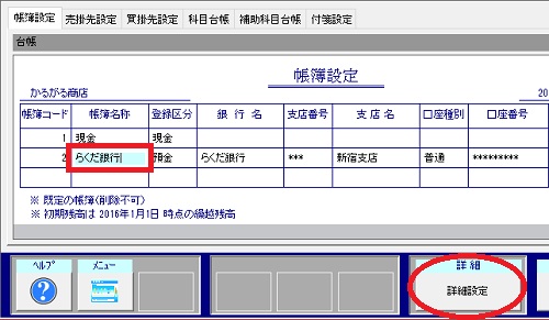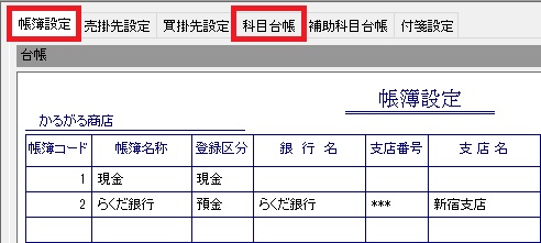 | (2) | [帳簿設定](または[科目台帳]タブ)をクリックします。 |