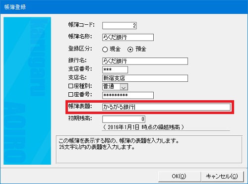 | (4) | 「帳簿登録」(または「科目登録」)画面が表示されますので、[帳簿表題]欄を編集します。 |