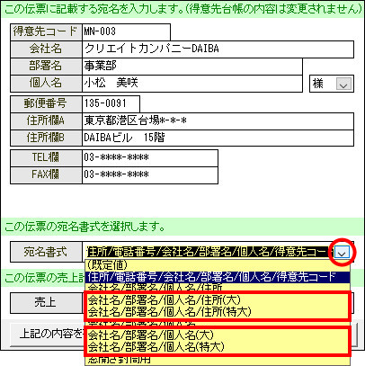 | (2) | 得意先の入力フォームが表示されますので、[宛名書式]欄の[▼]ボタンをクリックし、「会社名/部署名/個人名/住所(大)」等、最後に(大)・(特大)とつくものを選択します。 |