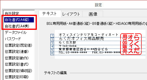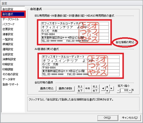 (2) | [自社書式]をクリックし、各書式欄の変更部分を直接編集するか、[自社情報の取込]ボタンをクリックして[自社設定]の内容を取り込みます。 |