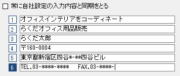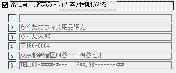 [テキスト]タブ内にある[常に自社設定の入力内容と同期をとる]にチェックをつけておくと、[自社設定]内の自社情報が常に反映されます。 |