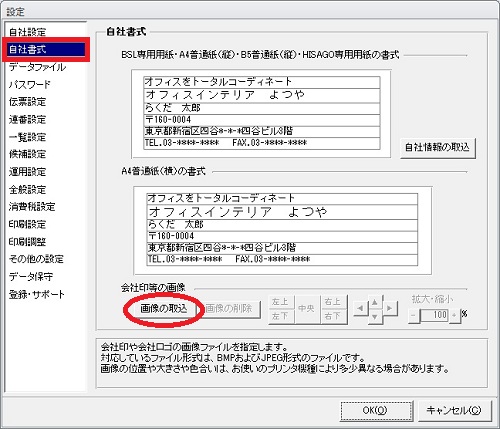 | 「販売らくだ5〜6」「かるがるできる販売2特別限定版〜4」の場合:[自社書式]をクリックし、「会社印等の画像」内にある[画像の取込]ボタンをクリックします。 |
