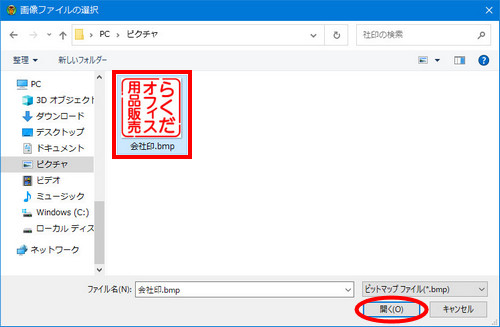 | (3) | 「画像ファイルの選択」画面が表示されますので、ファイルの種類(ビットマップファイル/JPEG)を指定し、取り込む画像ファイルを選択して、[開く]ボタンをクリックします。 |