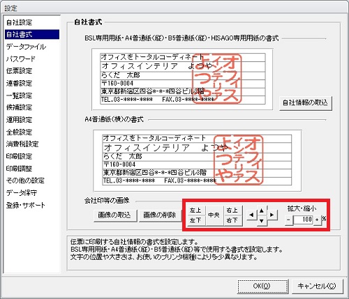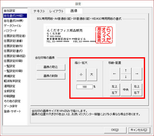 | (4) | 画像が取り込まれたことを確認し、「会社印等の画像」内にある各ボタンで位置調整や拡大・縮小を行います。 |