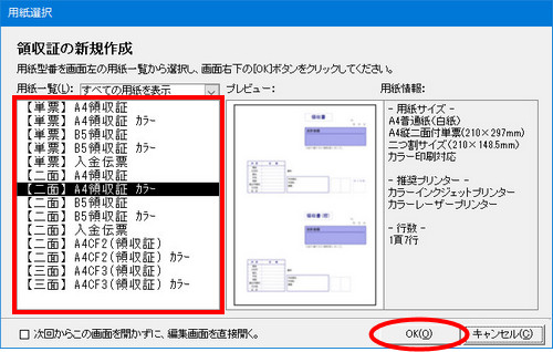 | (2) | 「領収証の新規作成」画面で、用紙型番を選択し[OK]ボタンをクリックします。 |