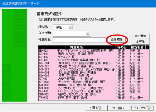 | 「請求先の選択」画面上部にある[締め日]または[自社担当]で得意先が絞り込まれている可能性があります。[条件解除]ボタンをクリックして絞り込みを解除し、得意先がすべて表示されることをご確認ください。 |