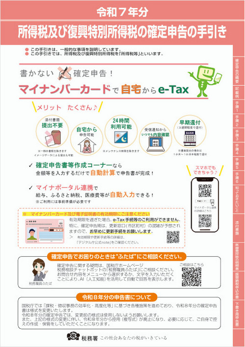 | 税務署から配布されている「令和7年分 所得税及び復興特別所得税の確定申告の手引き」を手元に置いておかれると、確定申告書をより円滑に作成することが可能です。 |