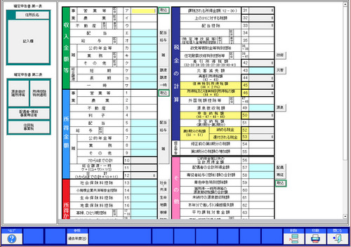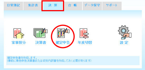 | メインメニューの[決算]タブ内にある[確定申告]アイコンをクリックすると、実際の確定申告書と同じ入力画面が表示されます。この画面に必要な情報を入力し、確定申告書を作成してください。 |