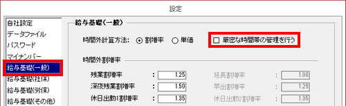 | (2) | 「設定」画面で[給与基礎(一般)]項目をクリックし、[厳密な時間帯の管理を行う]にチェックをつけます。確認メッセージが表示されますので、[OK]ボタンをクリックします。 |