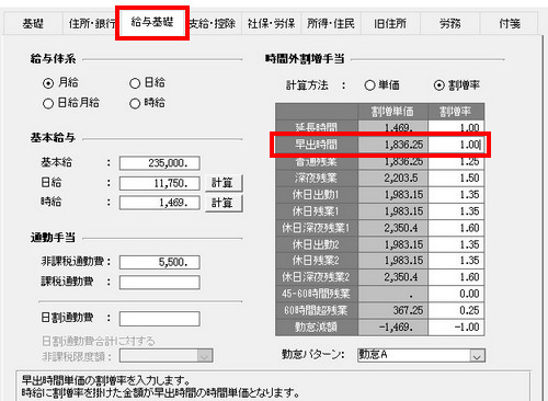 | (6) | 「社員情報」画面の[給与基礎]タブをクリックし、「時間外割増手当」内にある[早出時間]の[割増単価]または[割増率]を設定します。 |